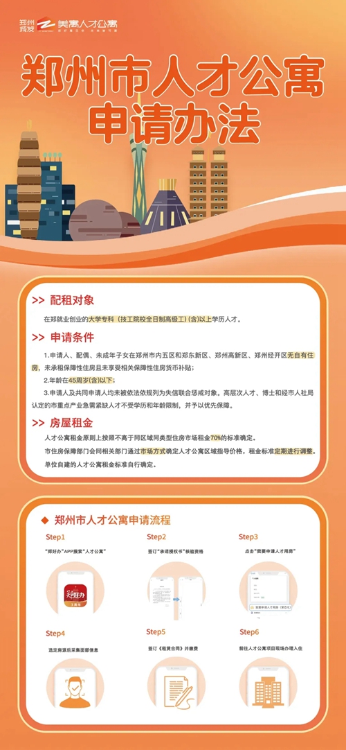 本批次配租全流程通過線上進行,按照“一網通辦、一網通管”的原則,申請人可登錄“鄭好辦”APP(“一件事專區(qū)”→“住房保障一件事”),進入人才公寓配租模塊,按照提示進行申請、選房、簽約和退出。