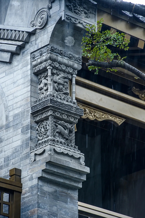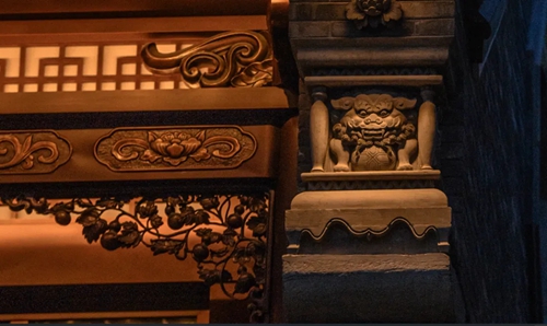 12號(hào)樓主題為獅子,主題來(lái)源于三門(mén)峽靈寶函谷關(guān),象征“事事如意”的獅子在柱子、平板枋、額枋、卡子花、假梁頭等構(gòu)件均有出現(xiàn)。