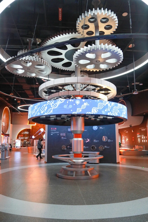 下一站是“看得見的奧秘”展廳。在參觀中,不難發(fā)現(xiàn),這里主要提煉了物質(zhì)、運(yùn)動(dòng)和能量三個(gè)小切口作為知識(shí)內(nèi)容,以“透過現(xiàn)象看本質(zhì)”為主題,劃分“物質(zhì)世界”“能量法則”“運(yùn)動(dòng)大觀”“度量萬物”四個(gè)分主題展區(qū)。