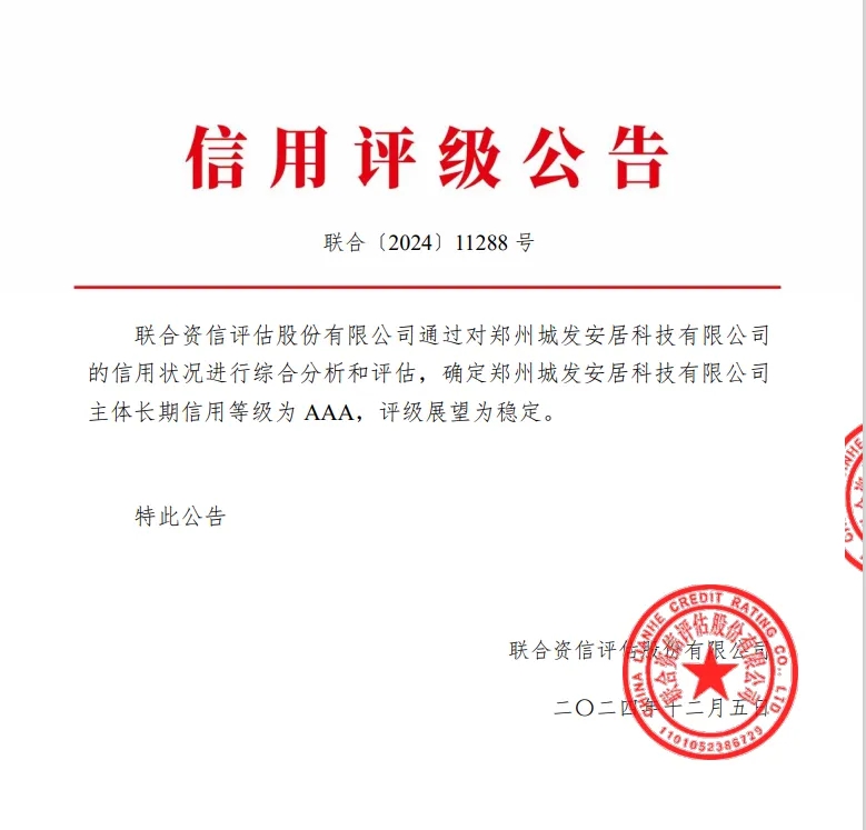 12月5日,鄭州城市發(fā)展集團有限公司下屬子公司鄭州城發(fā)安居科技有限公司(以下簡稱安居科技)順利取得AAA主體信用評級,評級展望為“穩(wěn)定”,成功邁入國內(nèi)企業(yè)信用等級第一梯隊。