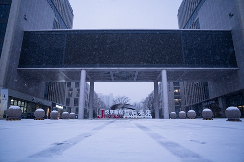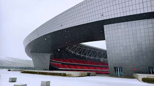 奧體中心的場(chǎng)館在白雪映襯下